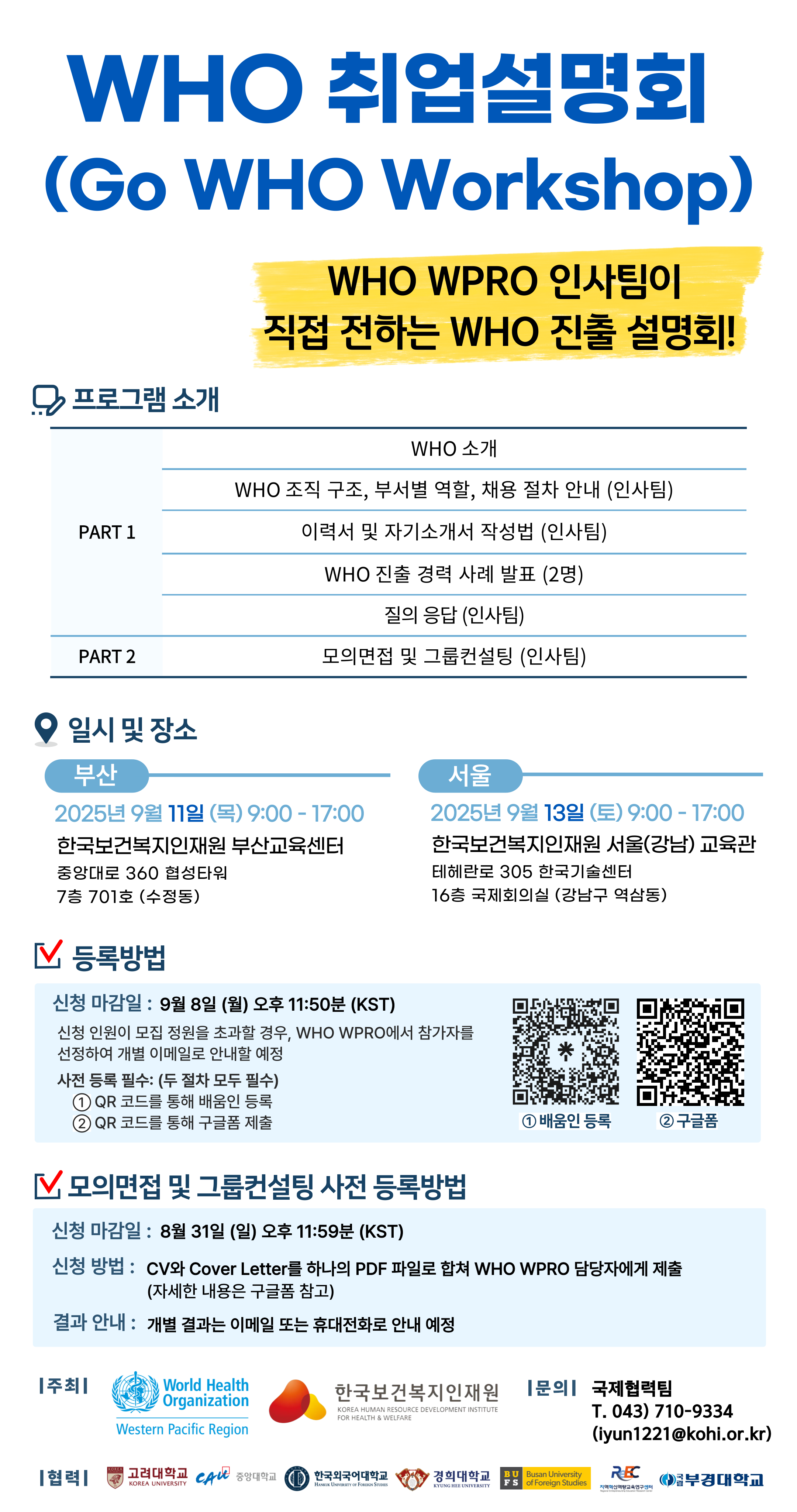 아래와 같이 보건복지부 산하 공공기관 한국보건복지인재원 주관 2025년「Go WHO Korea Workshop」를 안내드리오니 관심있는 학생(졸업생 포함)들은 신청바랍니다. 좋은 기회이오니 많은 관심 부탁드립니다. |