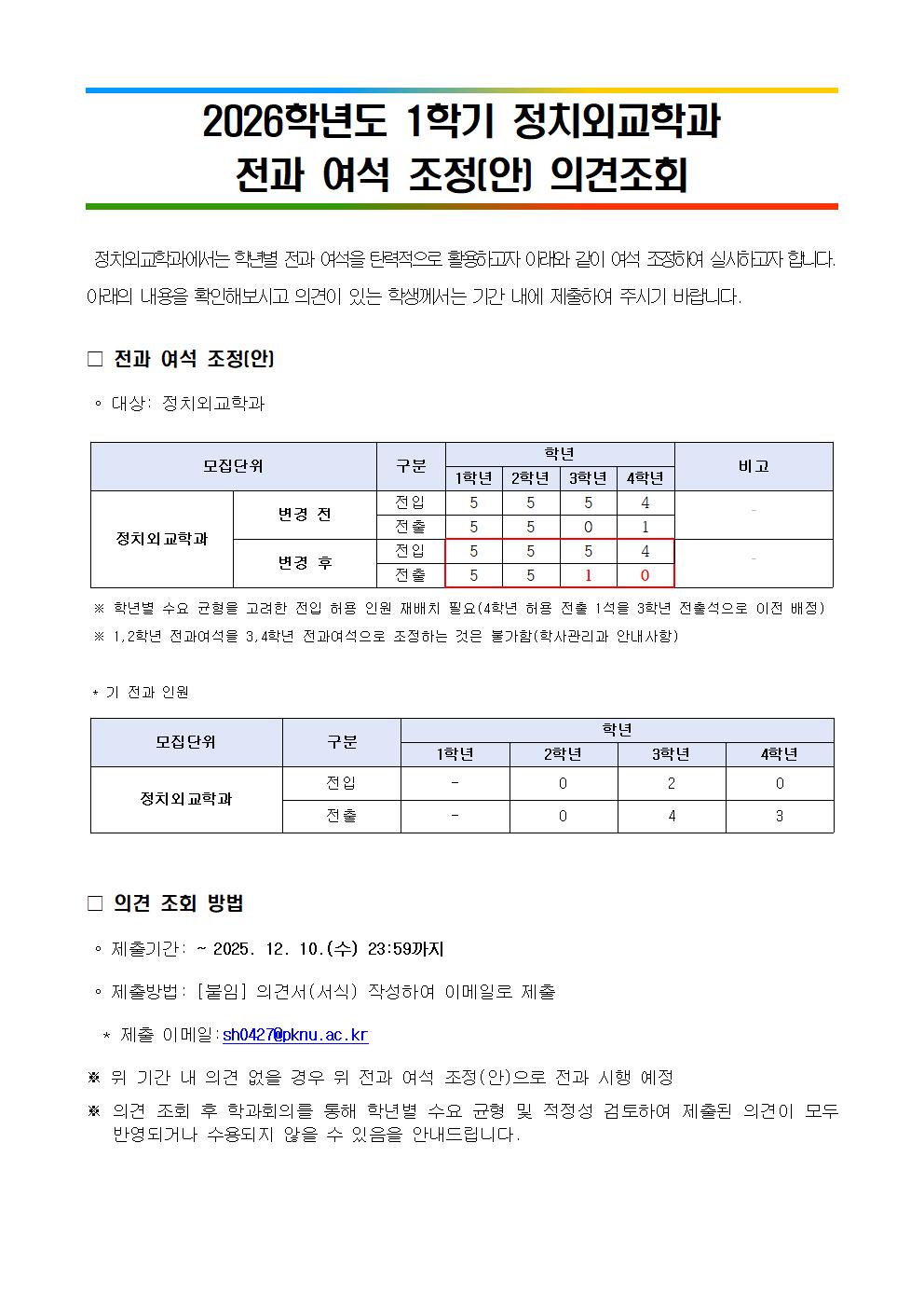 2026-1학기 정치외교학과 전과 여석 조정(안) 의견조회(~12/10)