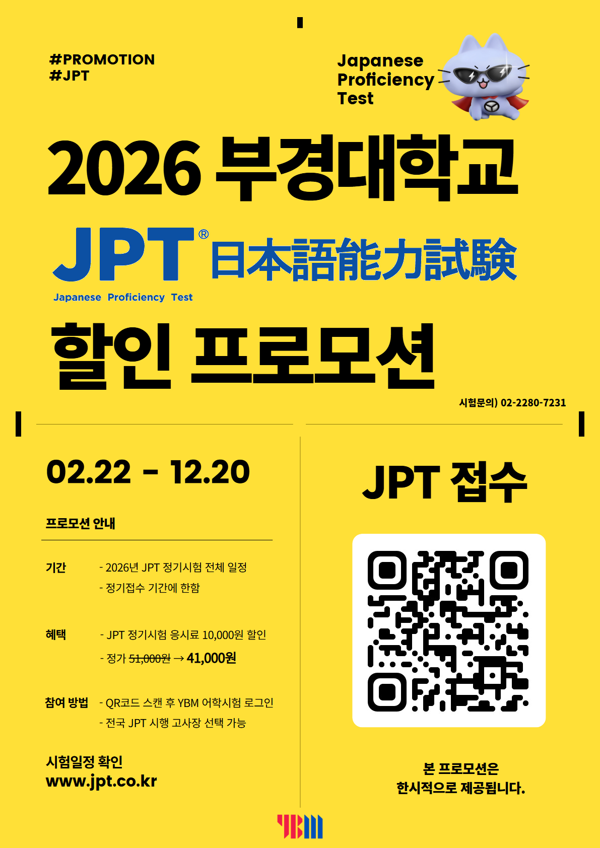 | 첨부파일 | 부경대학교 2026 JPT 할인 안내문.jpg 부경대학교 TOEIC Speaking 할인 QR 공지문.docx 부경대학교 TOEIC 할인 QR 공지문.docx | ||