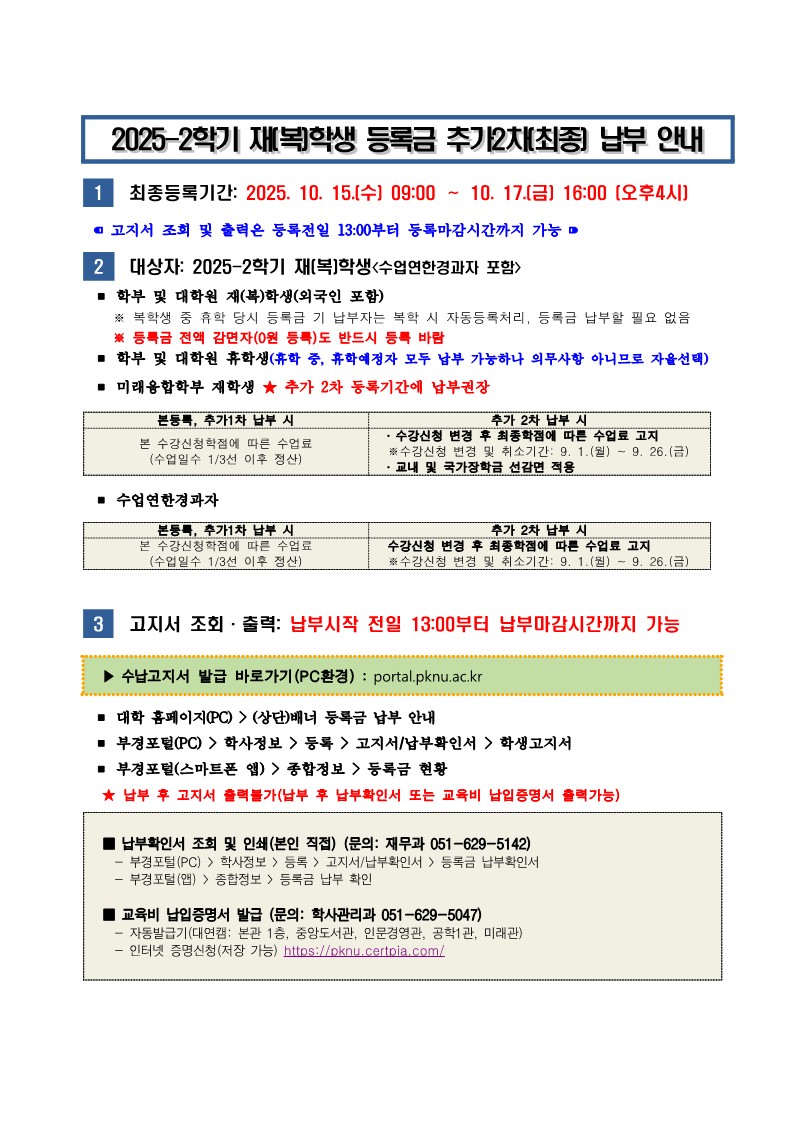 2025학년도 2학기 재(복)학생 등록금 추가2차(최종) 납부 안내
